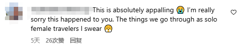 “这简直令人发指 !替你难过。身为独旅女性我们经历的这些事,我发誓,太多了...”