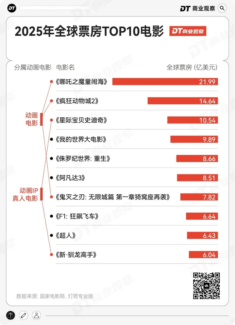 《哪吒2》《疯狂动物城2》《鬼灭之刃:无限城篇》三部动画大片上榜,《星际宝贝史迪奇》《新·驯龙高手》等真人+CG特效作品,也凭借动画IP的韧性斩获高票房。