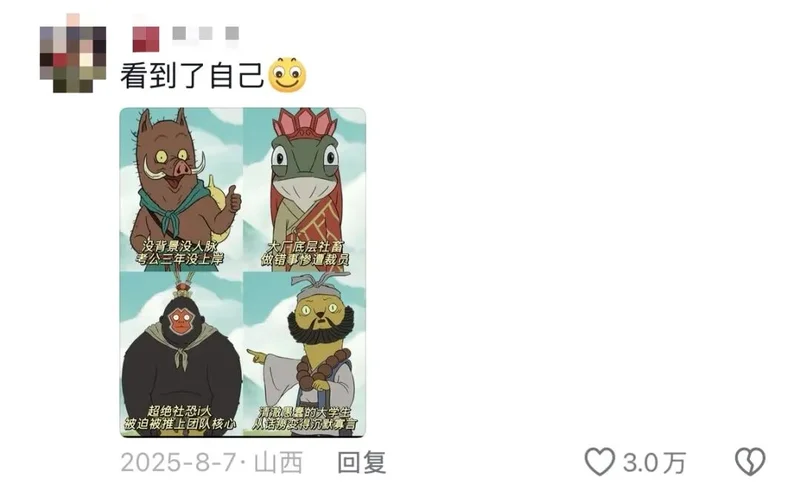 小猪妖“考不进大王洞”的挫败,对应当代青年考公、考编的内卷困境;黄鼠狼从“话唠”到“沉默”的转变,戳中了年轻人被社会磨平棱角、收起表达欲的成长阵痛,让不少观众直言“笑着笑着就哭了,看到了自己的影子”。