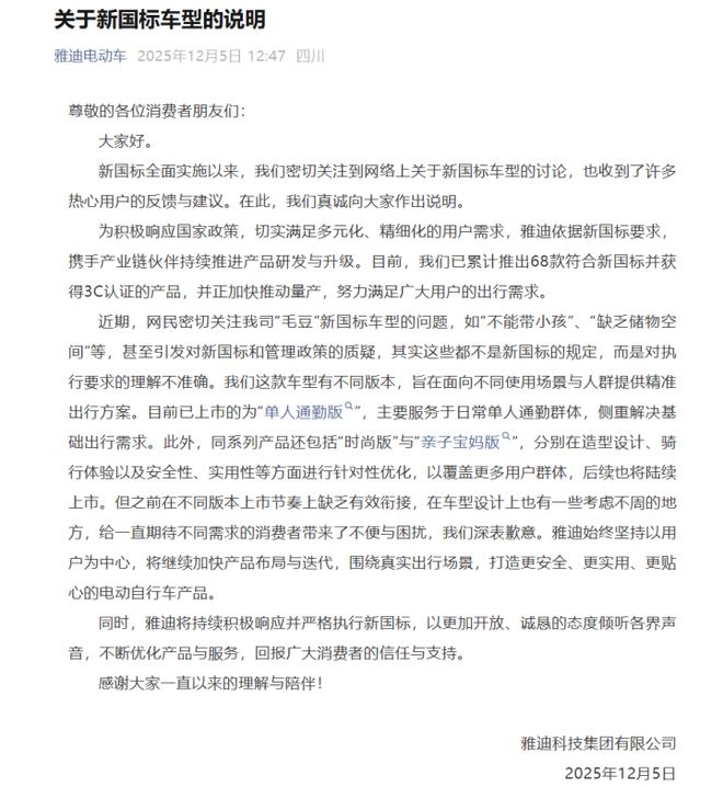 而就在今天下午,雅迪因一款新国标车型引起消费者质疑,发布了情况说明,并致歉,表示会不断优化产品与服务。