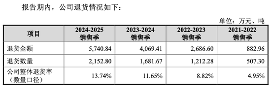 质疑并非空穴来风,2021-2025销售季,正大种业整体退货率分别为4.95%、8.82%、11.65%及13.74%,退货金额从882.96万元激增至5740.84万元。同时,前五大经销商的期末库存持续走高。