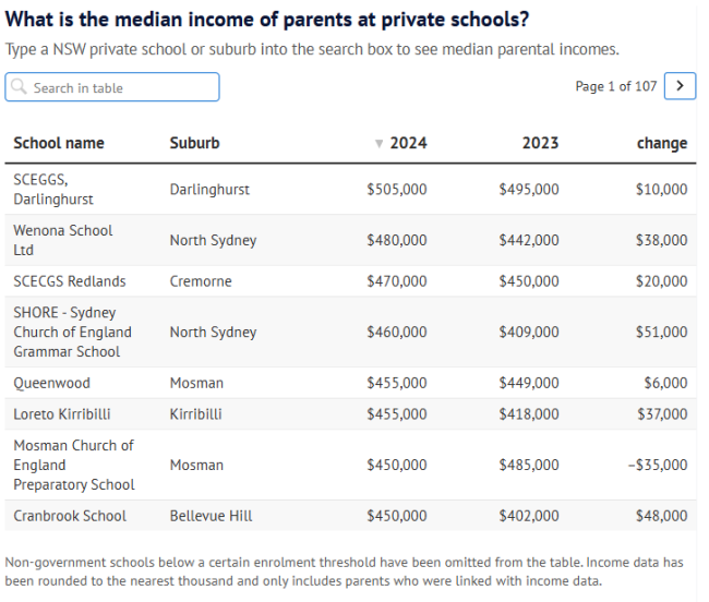 2024年的数据表明,SCEGGS Darlinghurst、Wenona、Redlands及Shore的家长年收入中位数为全州最高,介于460000至505000澳元之间。