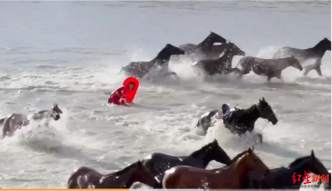 当傍晚7点钟赶到湿地公园时,特克斯河有些涨水。刚开始拍摄,奔腾的马群中,前一匹马摔倒,绊倒了贺娇龙骑的马,贺娇龙也跟着坠入河中。“河中摔着不疼,但被压在了马肚子下。”贺娇龙说,刚从水里站起来的时候,人有些懵,不知道自己在哪里,好在很快清醒过来,被赶过来的同伴救上另一匹马。