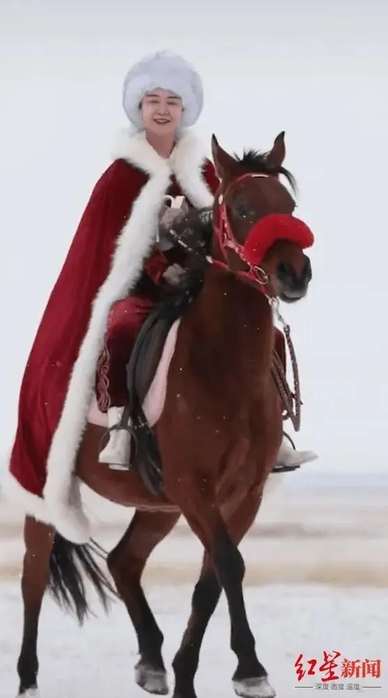 但很长一段时间,直播和短视频流量不高,在网络平台上,贺娇龙并没有引起网友的注意。直到2020年11月下旬,一段段“策马雪原”的短视频出现。在那段引起“围观”的视频中,贺娇龙身披红色斗篷,在雪原策马奔腾,迅速让当地文旅爆火出圈。