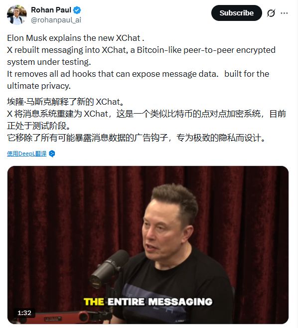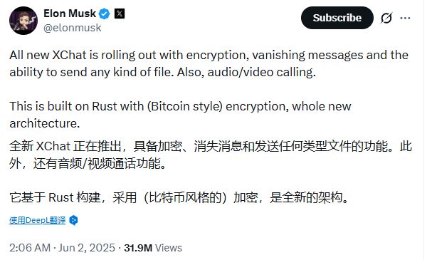 去年6月,马斯克在X平台发文宣布XChat开发计划,明确提及加密、阅后即焚、任意格式文件传输、音视频通话等核心功能,并披露该应用基于Rust语言构建,采用"比特币风格的加密"架构。