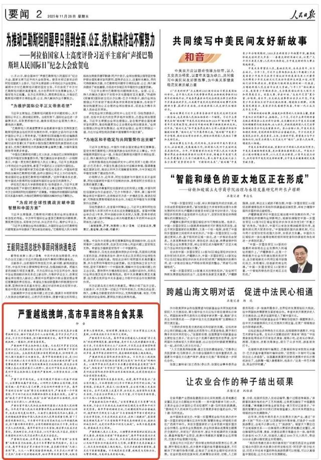 11月28日,《人民日报》第02版刊发“仲音”评论文章《严重越线挑衅,高市早苗终将自食其果》。