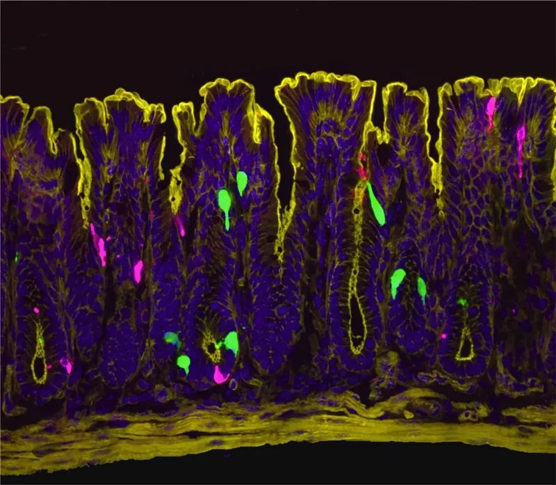这张放大图展示了结肠内壁。产生激素 PYY(肽 YY)的细胞呈绿色,产生神经递质血清素的细胞呈品红色。PYY 会触发血清素的释放,进而激活痛觉神经。图片来源:Archana Venkataraman/UCSF