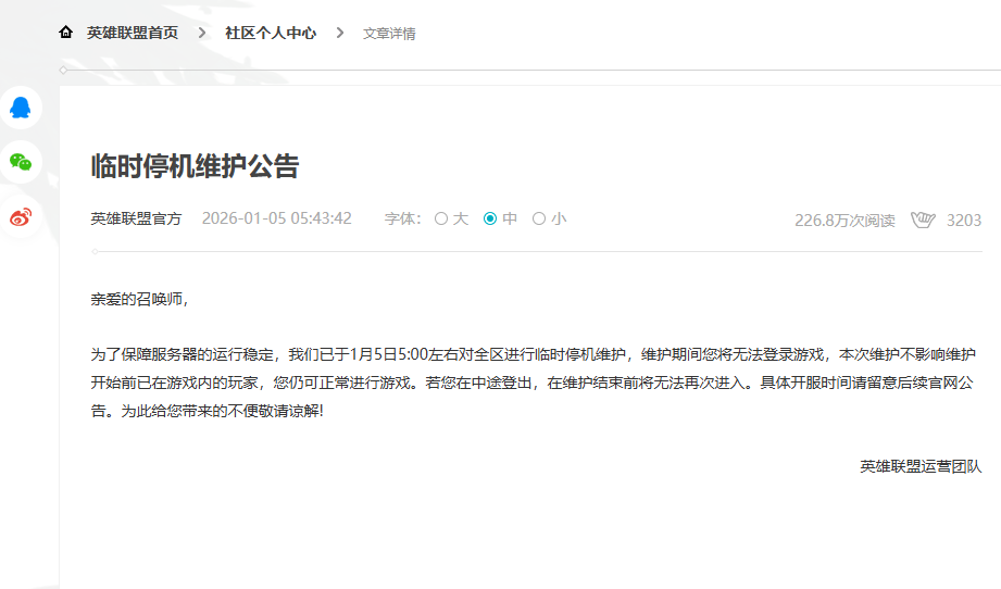 根据《英雄联盟》官方发布的最新公告,服务器已于1月5日15:00左右完成临时停机维护,目前全区已恢复正常开服。