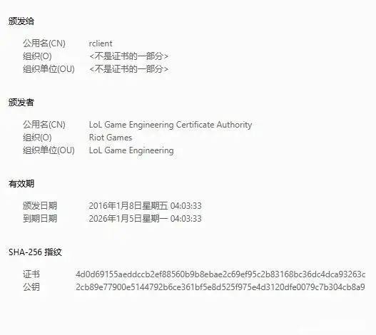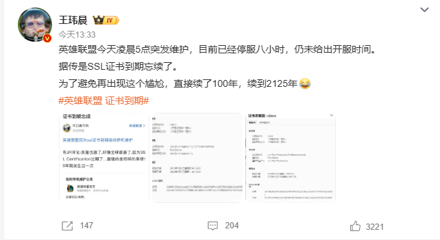 在相关话题下,有博主爆料称,此次维护疑似由于《英雄联盟》2016年签发的10年期SSL证书到期后未及时续期所致,甚至有传言称官方为避免类似情况再次发生,“一次性续了100年证书,直到2125年”。