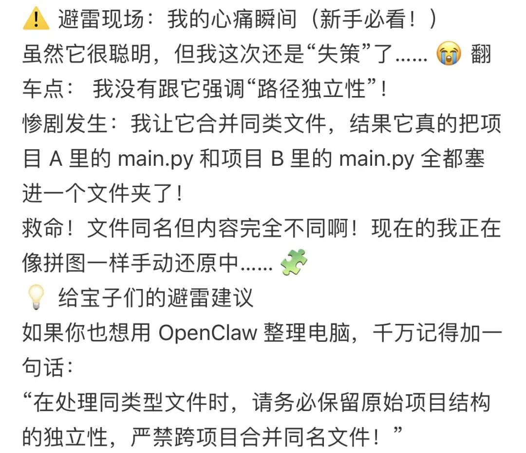 有网友让 OpenClaw 合并同类文件,它把项目 A 和项目 B 里同名的 main.py 全塞进了同一个文件夹。这两个文件名字虽一样、内容却截然不同,最后用户只能像拼图一样手动还原。
