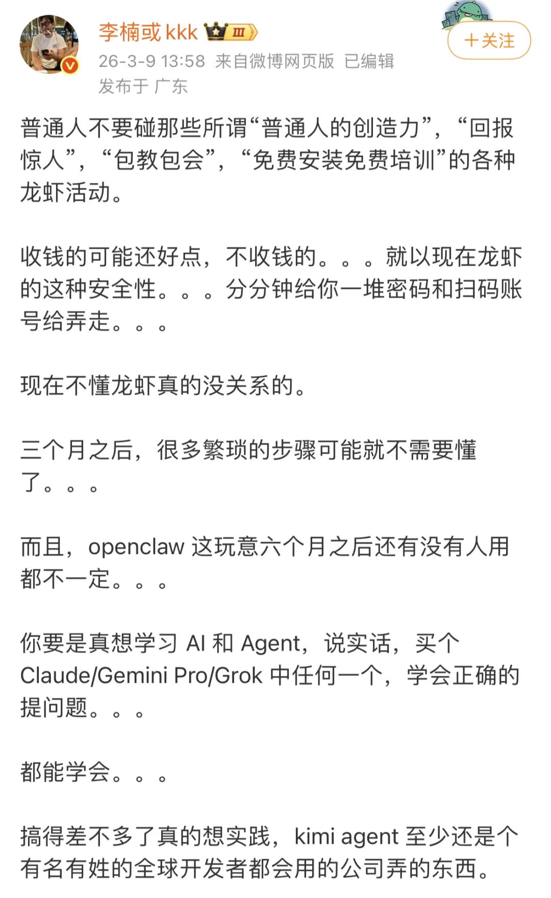 怒喵创始人李楠发微博吐槽免费装龙虾,「收钱的可能还好点,不收钱的…… 就以现在龙虾的这种安全性,分分钟给你账号密码弄走」。