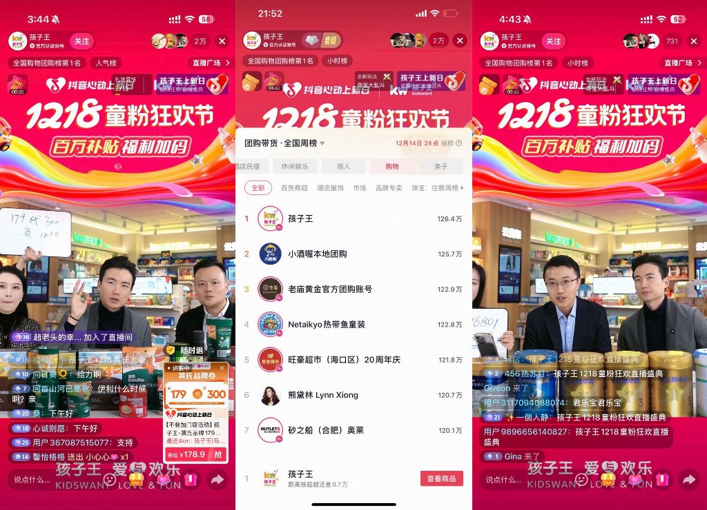 12月11日至12日,孩子王CFO蔡博先生与电商事业部总经理刘浩先生共同走进抖音直播间,完成了他们的“直播首秀”。这场直播跳脱了传统“叫卖式”带货的窠臼,精心营造了一个平等、开放、富含知识增量的对话场域。蔡总与浩总并未局限于单一的产品讲解,而是与品牌的高管围坐畅谈。他们如同老友聚会般,分享产品背后不为人知的科研故事,探讨前沿的育儿理念与方式,畅谈“在养育中自我成长”的真实感悟。这场充满真诚与干货的对话,迅速赢得了屏幕前广大宝爸宝妈的高度信任与情感共鸣。数据印证了这份成功:开播半小时观看人数即突破6000+,成交金额迅速超过50万,首日直播总GMV强势突破1500万大关,成功登顶抖音全国购物总榜TOP1,直播间实时在线人数峰值更是一度超过2万。