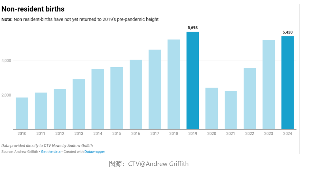 数据显示,非居民新生儿占总出生人口的比例,从2019—2020年的1.6%,在2020—2022年疫情期间下降到0.7%,但在2023—2024年及2024—2025年又回升至1.5%。