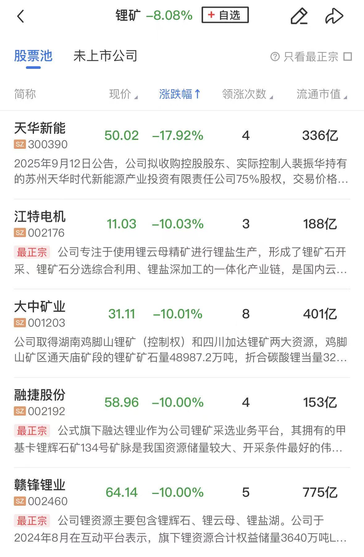 锂矿股集体重挫,赣锋锂业、天齐锂业、金圆股份、江特电机、西藏珠峰、盛新锂能、融捷股份、中矿资源等个股跌停。