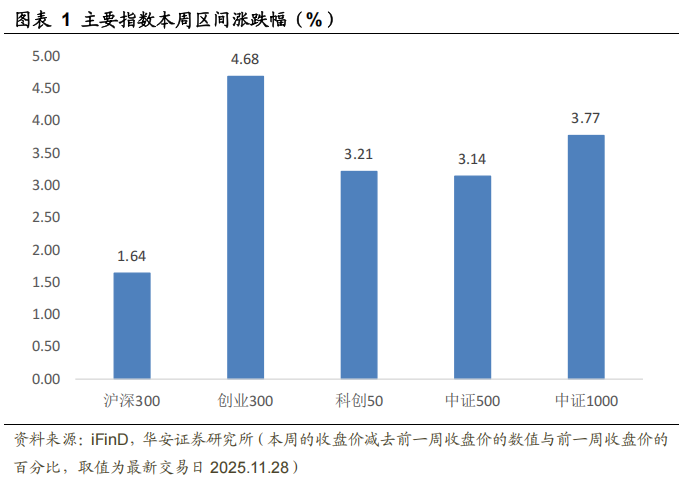 根据同花顺iFinD数据显示,本周A股主要指数均呈现明显回升。沪深300、创业300、科创50、中证500以及中证1000的指数周度涨跌幅分别为1.64%、4.68%、3.21%、3.14%以及3.77%,创业300回升幅度最为明显。