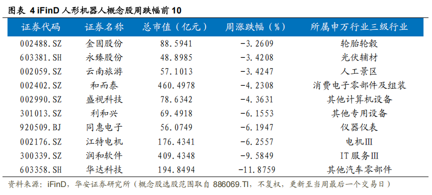 根据同花顺iFinD数据显示,本周A股主要指数均呈现明显回升。沪深300、创业300、科创50、中证500以及中证1000的指数周度涨跌幅分别为1.64%、4.68%、3.21%、3.14%以及3.77%,创业300回升幅度最为明显。根据同花顺iFinD数据显示,本周(20251124至20251128)人形机器人个股表现有所分化,其中iFinD人形机器人概念股涨幅前5的公司分别为力星股份、长盈精密、超捷股份、睿能科技以及广汽集团;跌幅前5的公司分别为华达科技、润和软件、江特电机、同惠电子以及利和兴。