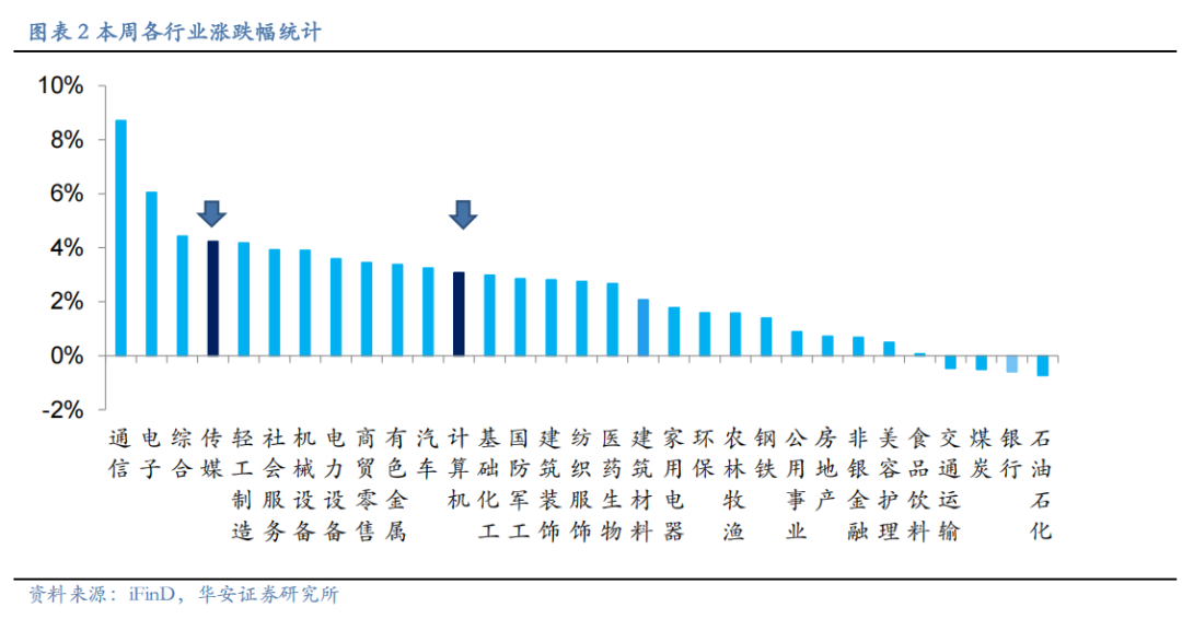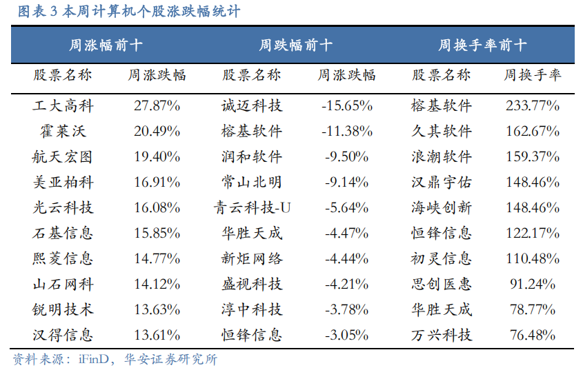 从涨跌幅情况来看,本周软件、信息技术个股表现较为突出。工大高科、霍莱沃、航天宏图居前。展望未来,我们仍建议关注景气度向上的金融IT、工业软件、信创等产业的投资机会。