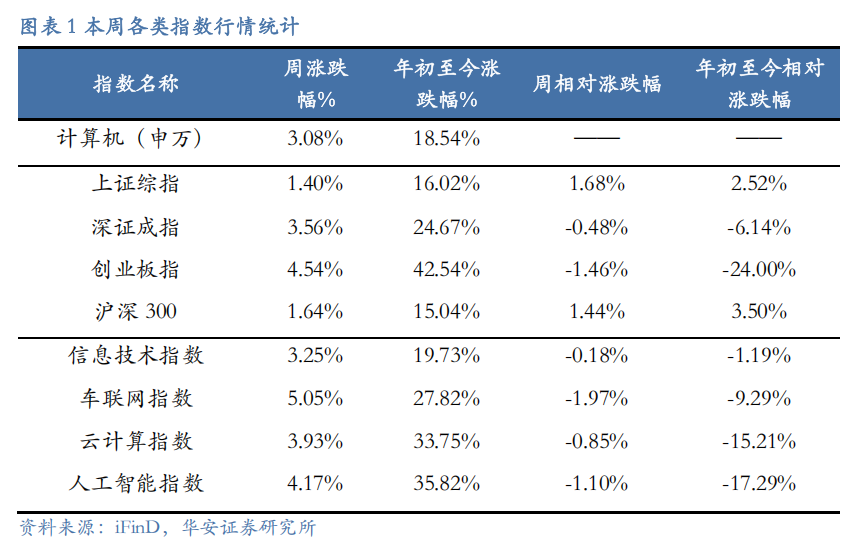 本周上证综指上涨1.40%,创业板指上涨4.54%,沪深300指数上涨1.64%。计算机行业指数上涨3.08%,跑赢上证综指1.68pct,跑输创业板指1.46pct,跑赢沪深300指数1.44pct。年初至今来看,计算机行业指数上涨18.54%。横向来看,本周计算机行业指数在申万31个行业指数中排名第12,在TMT四大行业(电子、通信、计算机、传媒)中位列第4。