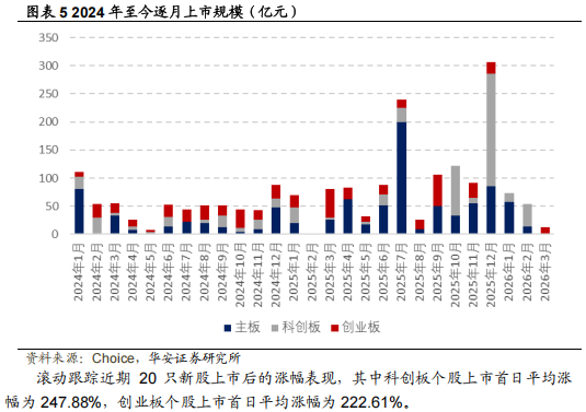 2024年以来逐月上市的新股规模如图表5所示。2026年3月沪深两市上市1只新股,募资规模12.01亿元。