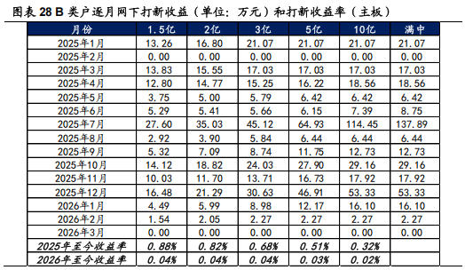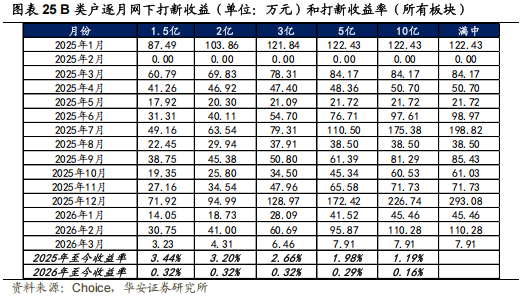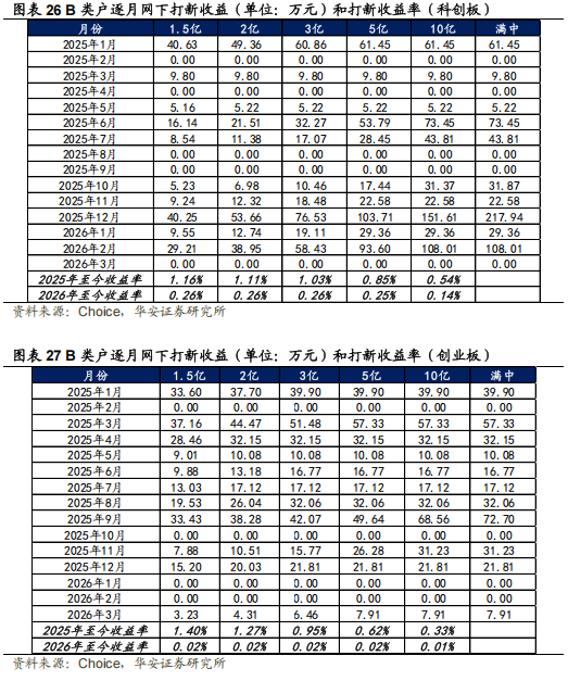 参照5.1中的测算方式,在不同规模B类户下,假设所有股票报价均入围,在90%的资金使用效率下,将2025年以来每个月网下打新可获得的收益相加,测算理想情况下逐月打新收益和打新收益率。以新股卖出日为统计时间,2026年至今B类2亿打新收益率0.32%,2025年至今B类2亿打新收益率3.20%。