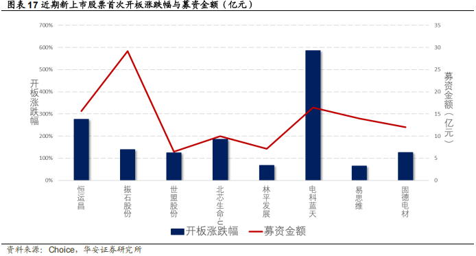 近两个月以来(2026年1月19日-2026年3月20日),大部分新上市股票的上市首日涨跌幅位于50%-600%水平区间内,上市首日涨跌幅最高的三家为电科蓝天、恒运昌、北芯生命-U,分别达到585.75%、276.44%、185.65%。大部分新股募资金额位于5-20亿元水平区间内,其中募资金额最高的三家为振石股份、电科蓝天、恒运昌,分别为29.19、16.45、15.61亿元。