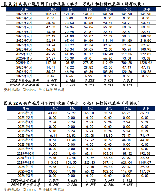 我们跟踪近期科创板+创业板+主板的网下打新市场表现,假设所有主板、科创板、创业板的股票都打中,且上市首日以市场均价卖出,忽略锁定期的卖出限制,2026年截至3/20,A类2亿规模账户打新收益率0.35%,B类2亿规模账户打新收益率0.32%;A类10亿规模账户打新收益率0.18%,B类10亿规模账户打新收益率0.16%,如图表1、图表3所示,2025年以来的累计打新收益率曲线如图表2、图表4所示,A类分多档询价的股票以A类平均中签率计算打新收益率。
