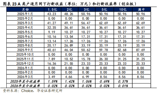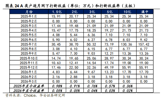 参照5.1中的测算方式,在不同规模A类户下,假设所有股票报价均入围,在90%的资金使用效率下,将2025年以来每个月网下打新可获得的收益相加,测算理想情况下逐月打新收益和打新收益率。以新股卖出日为统计时间,2026年至今2亿打新收益率0.35%,2025年至今2亿打新收益率4.15%。