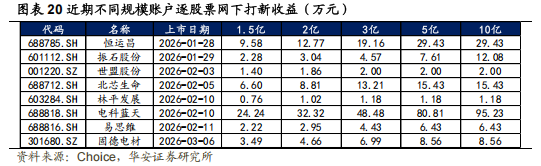 我们测算了不同规模资金的网下A类打新收益。假设使用网下A类平均中签率、账户参与所有新股打新、科创板和创业板报价全部入围、资金配置一半沪市一半深市且股票满仓、按首次开板日均价卖出、在90%的资金使用效率下我们测试不同账户规模下的逐股票网下打新收益。图表20列举了在1.5亿、2亿、3亿、5亿、10亿账户规模下,以A类平均网下中签率为例,假设科创板和创业板全部入围,近两个月内(2026年1月19日至2026年3月20日)上市新股的网下打新收益。