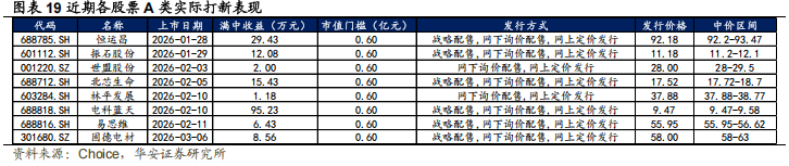 跟踪近期科创板+创业板+主板的网下打新市场表现,假设所有主板、科创板、创业板的股票都打中,且上市首日以市场均价卖出,忽略锁定期的卖出限制,2026年截至3/20,A类2亿规模账户打新收益率0.35%,B类2亿规模账户打新收益率0.32%;A类10亿规模账户打新收益率0.18%,B类10亿规模账户打新收益率0.16%。滚动跟踪近期20只新股上市后的涨幅表现,其中科创板个股上市首日平均涨幅为247.88%,创业板个股上市首日平均涨幅为222.61%。跟踪近期新股的有效报价账户数,最近一只科创板新股A类有效报价账户数量为5178,B类有效报价账户数量为2324。最近一只创业板新股A类有效报价账户数量为4858左右,B类有效报价账户数量为3071。最近一只沪市主板新股A类有效报价账户数量为5083,B类有效报价账户数量为3195,最近一只深市主板新股A类有效报价账户数量为5118,B类有效报价账户数量为3162。