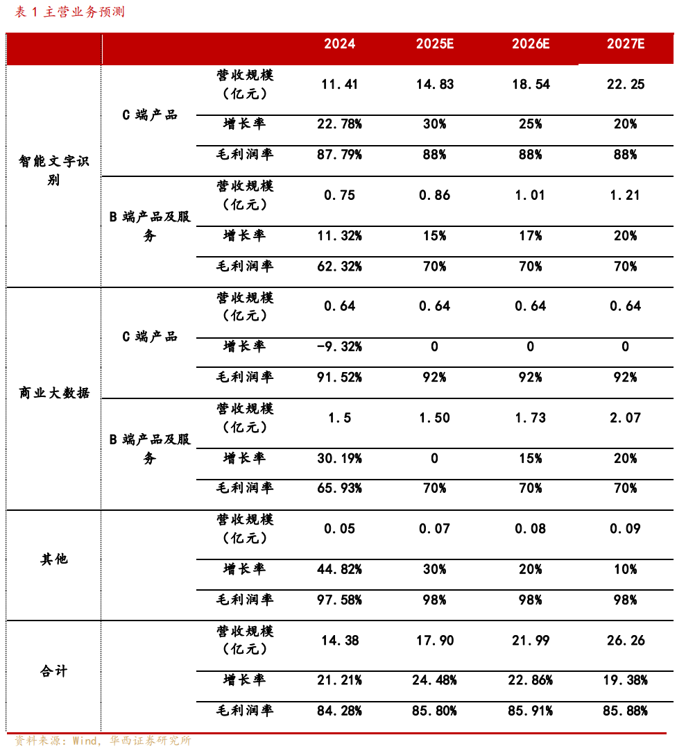 1、智能文字识别:智能文字识别业务是公司当下收入的核心来源之一。其中,C端业务为其传统优势领域,预计维持增长态势,预计公司2025-2027年收入增速分别是30%/25%/20%,毛利率分别是88%/88%/88%;B端业务方面,我们认为此前受到公司定制化业务向标准化业务的转型影响,带来短期的增速下降,自25年起来有望重拾增速,且毛利润率将提升,预计公司2025-2027年收入增速分别是15%/17%/20%,毛利率分别是70%/70%/70%。