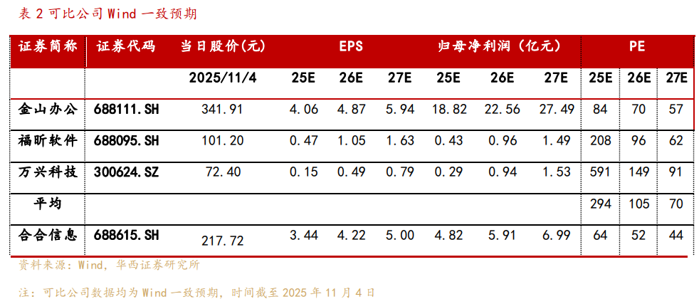 我们选取金山办公、福昕软件、万兴科技作为可比公司,以上公司为办公相关软件行业公司,和公司业务具备共同性。2025年可比公司PE为294x。 我们预计公司25-27年营收为17.90/21.99/26.26亿元,归母净利润为4.82/5.91/6.99亿元,EPS为3.44/4.22/5.00元。按照2025年11月6日收盘股价217.72元/股,公司2025至2027年PE为63/52/44倍。公司是办公软件行业相关的优质企业,三季度经营向好,出海及AI有望构建增长驱动力。首次覆盖,给予"增持"评级。