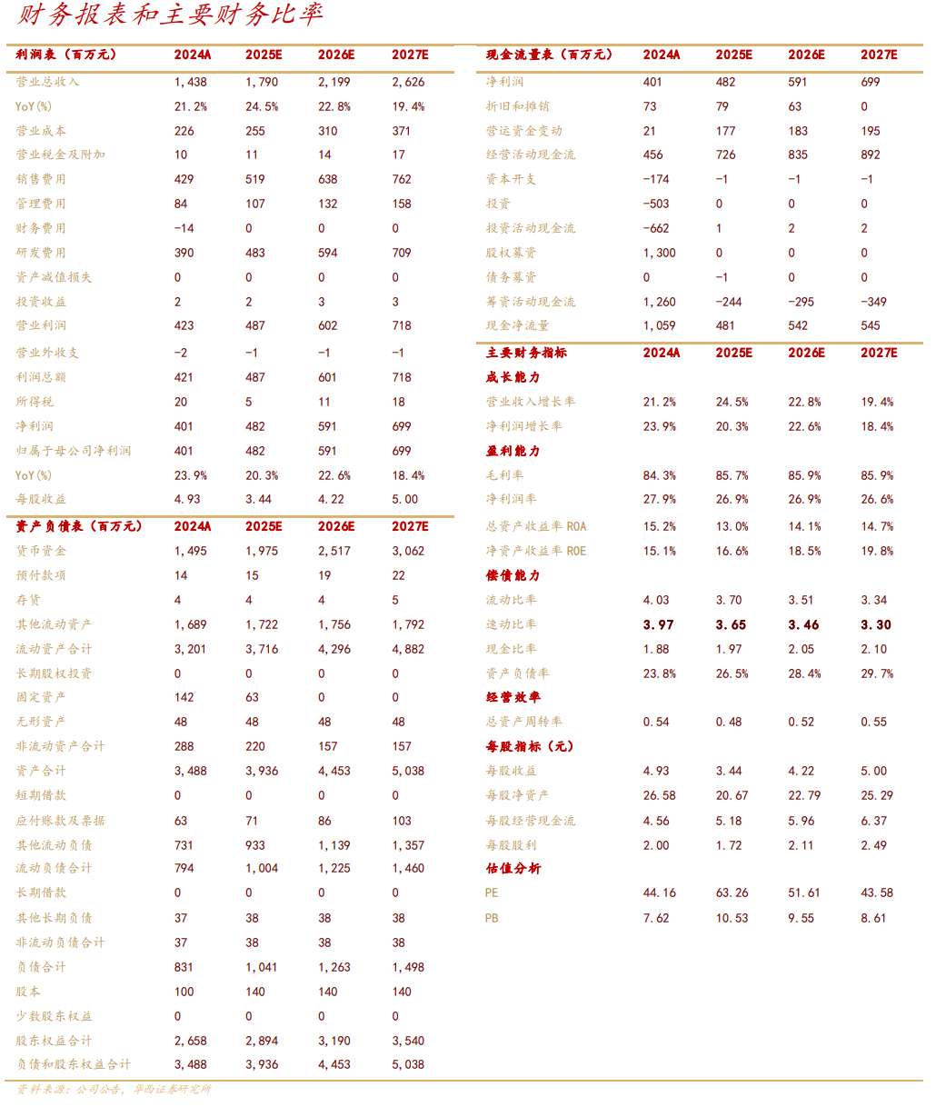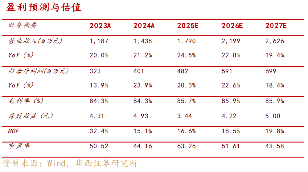 我们预计公司25-27年营收为17.90/21.99/26.26亿元,毛利润率为85.80%/85.91%/85.88%,归母净利润为4.82/5.91/6.99亿元,EPS为3.44/4.22/5.00元。