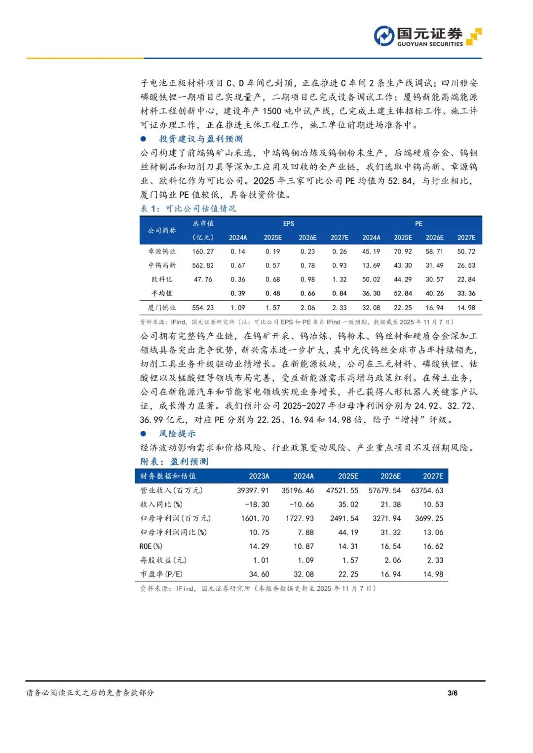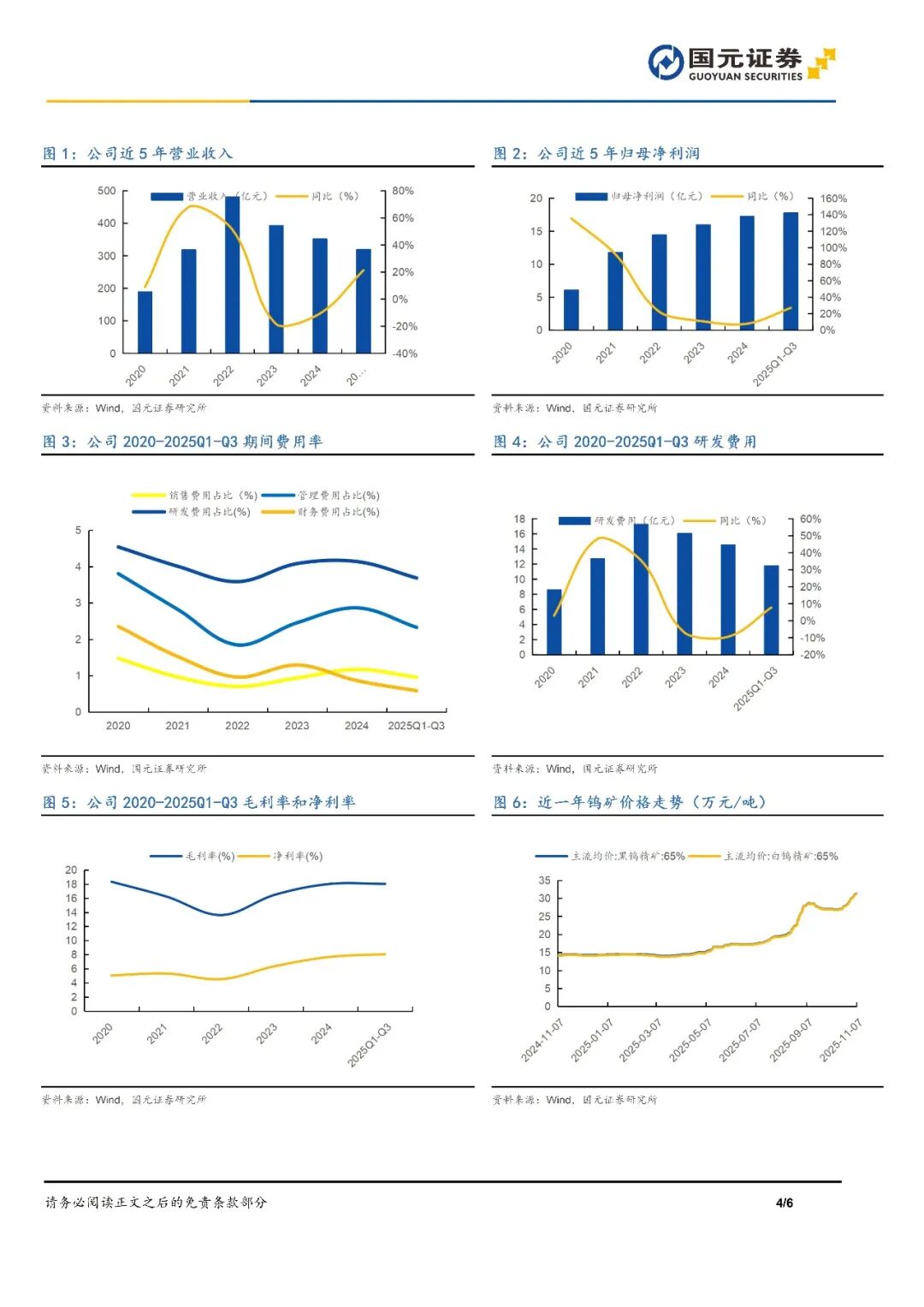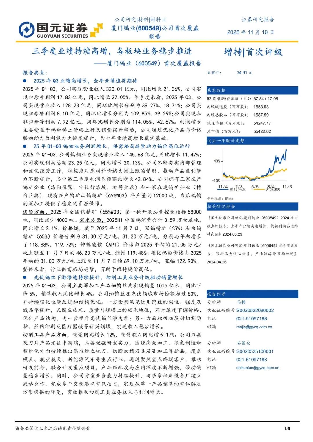 本报告摘自国元证券2025年11月10日已发布的《三季度业绩持续高增,各板块业务稳步推进——厦门钨业(600549)首次覆盖报告》,具体报告及分析内容请详见报告。若因对报告的摘编等产生歧义,应以报告发布当日的完整内容为准。