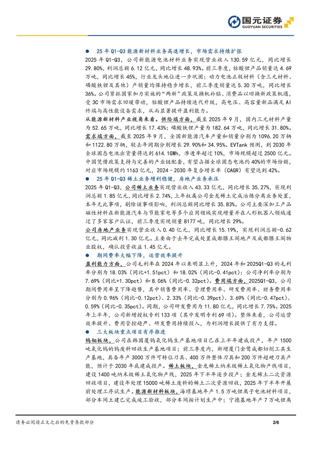 2025年Q1-Q3,公司新能源电池材料业务实现营业收入130.59亿元,同比增长29.80%,利润总额6.12亿元,同比增长48.93%。前三季度,钴酸锂产品销量达4.69万吨,同比增长45%,行业龙头地位进一步巩固;动力电池正极材料(含三元材料、磷酸铁锂及其他)产销量均保持稳步增长,前三季度销量达5.30万吨,同比增长36%。公司紧抓国家加力实施的“两新”政策及换机补贴、消费品以旧换新政策机遇,受3C市场需求回暖带动,钴酸锂产品持续迭代升级,高电压、高容量新品满足AI终端与高性能设备需求,从而显著提升盈利能力。