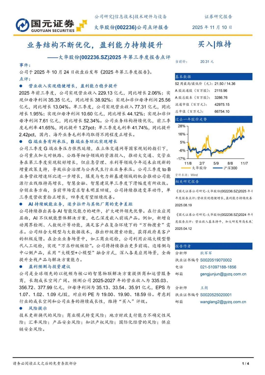 本报告摘自国元证券2025年11月10日已发布的《业务结构不断优化,盈利能力持续提升——大华股份(002236.SZ)2025年第三季度报告点评》,具体报告及分析内容请详见报告。若因对报告的摘编等产生歧义,应以报告发布当日的完整内容为准。