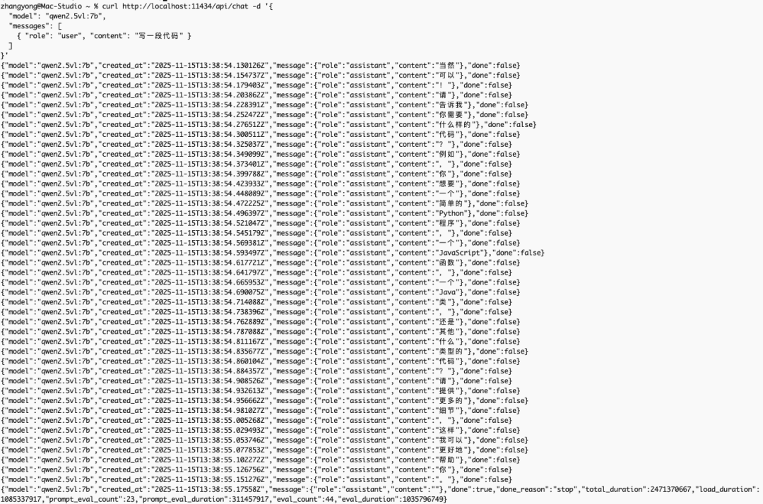 curl http://localhost:11434/api/chat -d ‘{ “model”: “qwen2.5vl:7b”, “messages”: [ { “role”: “user”, “content”: “写一段代码” } ]}’