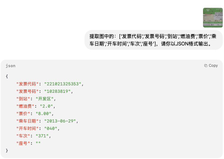 我们也可以通过该模型识别图像中的文字、公式或抽取票据、证件、表单中的信息,支持格式化输出文本: