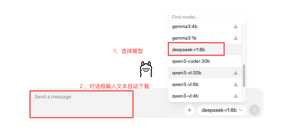 在 GUI 界面选择模型 ,若未下载会显示下载图标,然后在对话框中输入任意文本即可自动下载。