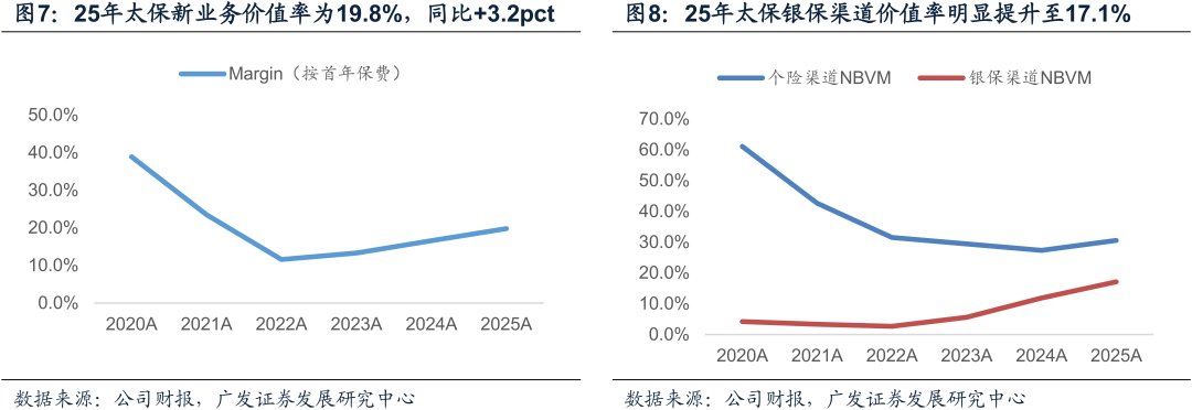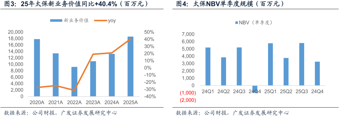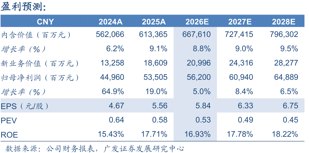 量价齐升推动NBV两位数增长。NBV同比+40.4%,较三季报32.3%进一步提升。全年新单保费同比+15.7%,其中个险持平,而银保受益于存款搬家而增长40.2%。NBVM为19.8%,同比+3.2pct,报行合一、预定利率下调叠加公司调整非传统险产品风险贴现率从8.5%至7.5%,推动价值率的提升。EV同比+9.1%(寿险EV同比+10.2%),超出预期,虽然投资偏差负贡献,但由于调整风险贴现率正向贡献1.3%,而去年同期为-12.1%。展望26年,分红险销售受益于大量存款到期有望持续向好,但价值率将小幅下降,价值稳定增长可期。
