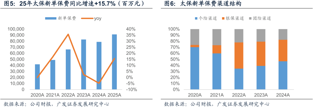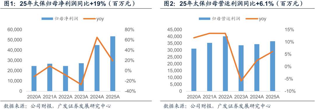 投资推动业绩稳定增长,Q4单季度业绩增长超预期。全年归母净利润同比+19%,略微优于预期,其中保险服务业绩同比+1.5%,保持稳定增长,而投资服务业绩同比+40.9%。Q1、Q2、Q3、Q4单季度利润增速分别为-18.1%、36.5%、35.2%、17.4%,Q4单季度净利润实现正增长超出预期,明显优于同业:一是公司下半年“股+基”占比仅提升1.8pct至13.8%,明显低于同业,且预计以稳定的红利资产为主;二是24Q4单季受审慎税务处理导致所得税为41.7亿元,而所得税即将按照新准则缴纳,25Q4税收转回23.5亿元。展望26年,公司权益资产倾向配置红利资产,有望在市场波动背景下取得较好的业绩增长。