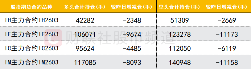 四大期指主力合约中,IH、IF、IC、IM合约多空双方均减仓,其中IF、IM合约空头减仓数量较多。
