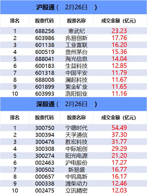 从沪股通前十大成交个股来看,寒武纪位居首位;兆易创新和工业富联分居二、三位。
