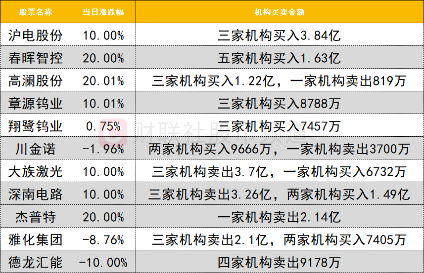 今日龙虎榜机构活跃度明显提升,买入方面,沪电股份强势涨停,获三家机构买入3.84亿,同时深股通买入7.37亿。商业航天概念股春晖智控20cm涨停,获五家机构买入1.63亿。