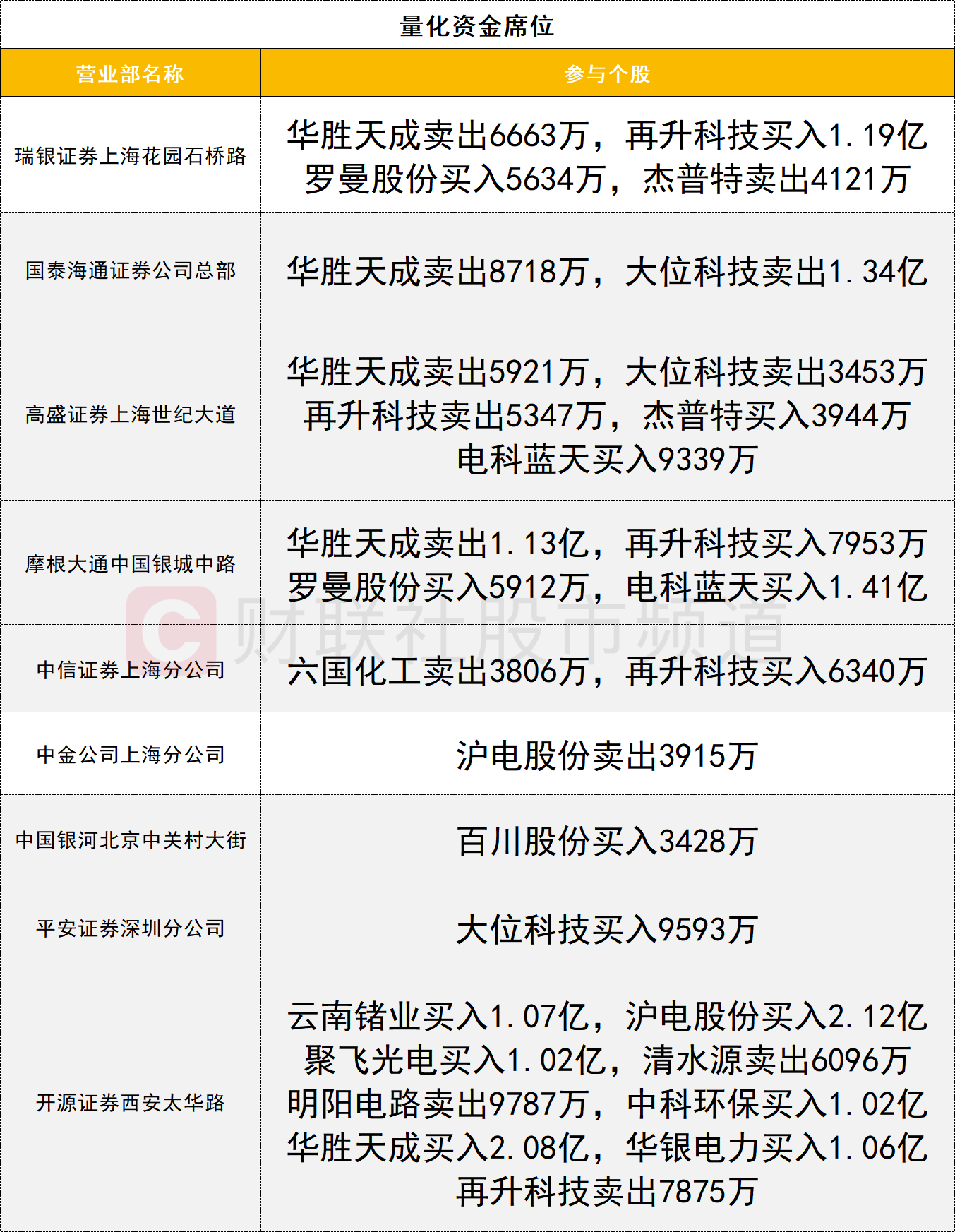 量化资金活跃度明显提升,沪电股份获一家量化资金(开源证券西安太华路)买入2.12亿。华胜天成遭量化激烈博弈,其中一家量化(开源证券西安太华路)买入2.08亿,四家量化(摩根大通中国银城中路、国泰海通证券公司总部、瑞银证券上海花园石桥路、高盛证券上海世纪大道)合计卖出3.26亿。
