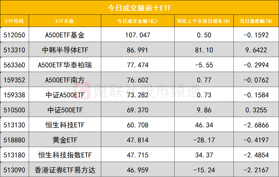 从成交额前十的ETF来看,A500ETF基金(512050)成交额位居首位,中韩半导体ETF(513310)成交额位居次席。