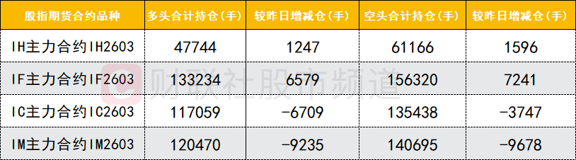 四大期指主力合约中,IH、IF合约多空双方均加仓,IC、IM合约多空双方均减仓,IC合约多头减仓数量较多,多空都在收缩,整体情绪偏谨慎。