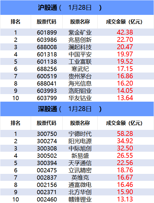 从沪股通前十大成交个股来看,紫金矿业位居首位;兆易创新和澜起科技分居二、三位。