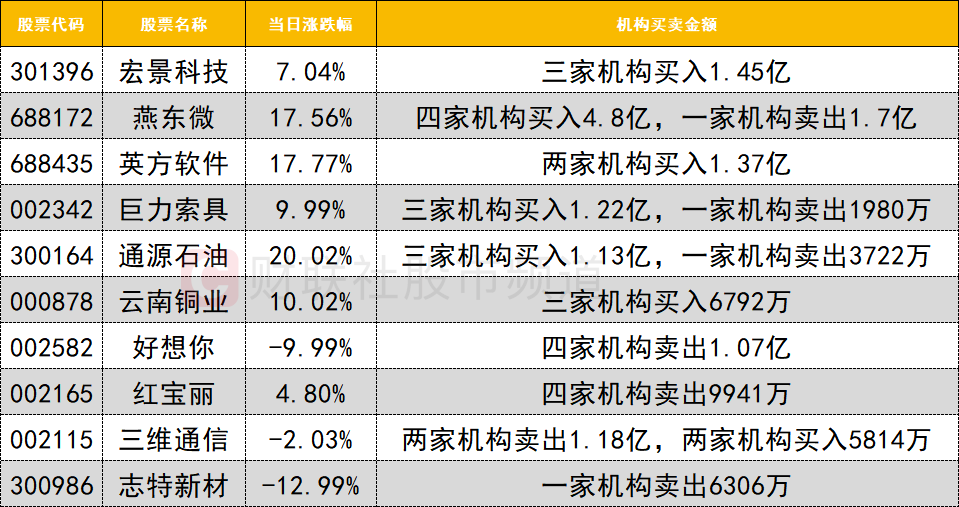 今日龙虎榜机构活跃度有所降低,买入方面,算力租赁概念股宏景科技获三家机构买入1.45亿。商业航天概念股巨力索具午后快速涨停,三家机构买入1.22亿,同时一家机构卖出1980万。今日油气股表现活跃,人气股通源石油20cm涨停,获三家机构买入1.13亿,同时遭一家机构卖出3722万。