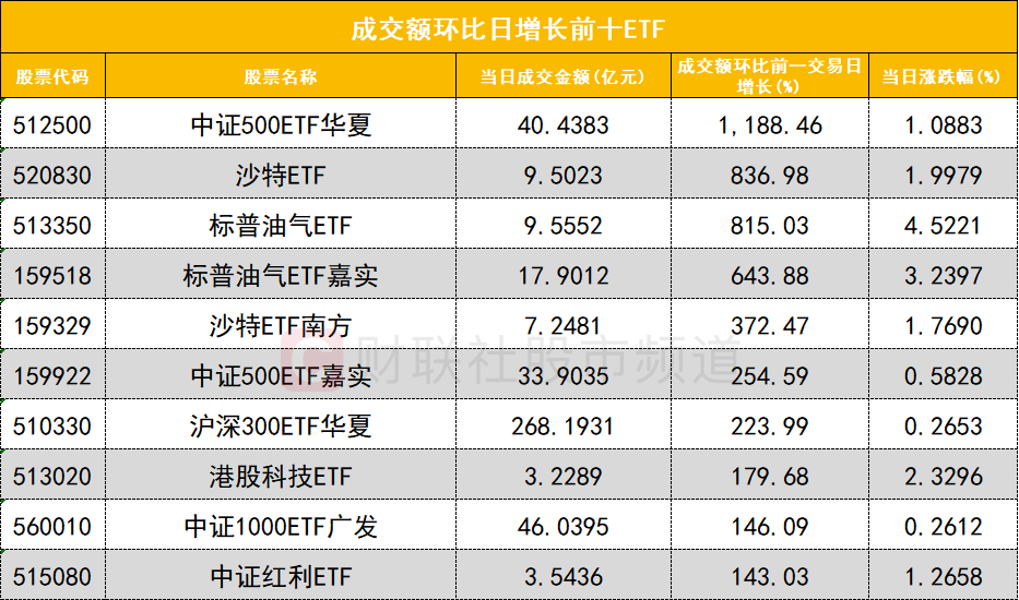 从成交额环比增长前十的ETF来看,中证500ETF华夏(512500)成交额环比增长1188%位居首位;沙特ETF(520830)成交额环比增长836%位居次席。