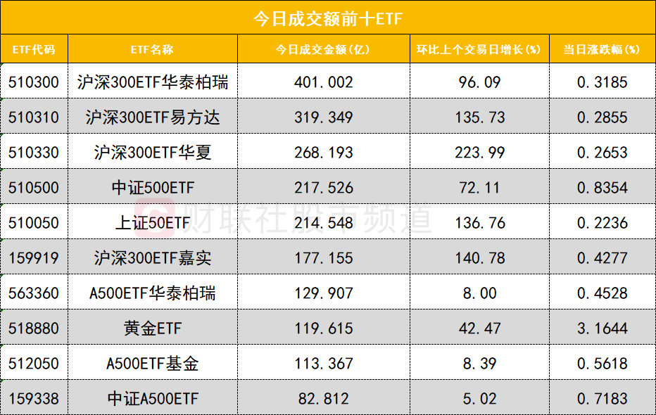 从成交额前十的ETF来看,沪深300ETF华泰柏瑞(510300)成交额位居首位,沪深300ETF易方达(510310)成交额位居次席。